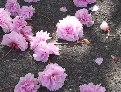 4月7日 雨はそれ程ひどくなく 朝の内に止みましたが 地面にはポツポツと花が落ちていました。 でも全部散らなくて良かった〜♪ 職場の近くの公園にて。 |